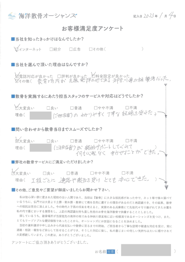 当初の資料請求や申し込みから代金支払いや散骨に至るまでの終結、ご担当者から丁寧な説明や敏速な対応を受け、常に連絡・相談・報告など安心して任せることができ、そうした対応に接し、私の墓じまいの侘しい気持ちは大いに癒やされて大変感謝しています。この度は、ありがとうございました。