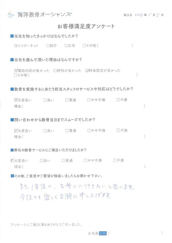 長年、納骨との悩みが、散骨をしていただいた事で、気が晴れました